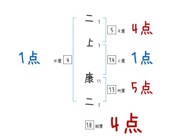 天運![]() | 二上康二さんの天運は5画の4つ星!健康で安泰。協調性に優れ、財産に恵まれる。 家系が持つ宿命的な運勢を表します。祖先から受け継いだ苗字ですので自分の力が及びません。家柄を象徴します。 |