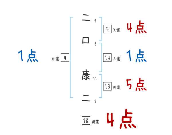 天運![]() | 二口康二さんの天運は5画の4つ星!健康で安泰。協調性に優れ、財産に恵まれる。 家系が持つ宿命的な運勢を表します。祖先から受け継いだ苗字ですので自分の力が及びません。家柄を象徴します。 |