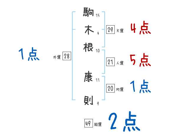 天運![]() | 駒木根康則さんの天運は29画の4つ星!完全主義で才能がある。厳格な心の持ち主。 家系が持つ宿命的な運勢を表します。祖先から受け継いだ苗字ですので自分の力が及びません。家柄を象徴します。 |