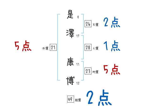 総運![]() | 是澤康博さんの総運は49画の2つ星!不安定な性格で明暗がある人生。周りの人には支援されやすい。 あなたの人生を表す1番重要な運勢です。生涯を通じて影響する総合運となり、主に50歳以降の晩年期に影響を及ぼします。 |