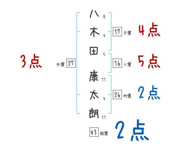 外運![]() | 八木田康太朗さんの外運は27画の3つ星!頭脳明晰だが強情で摩擦が多い傾向。孤立に注意。 生活面を象徴する運勢です。外部から受ける影響力を表し、結婚運、家庭運や職場、環境への順応性を表します。 |
