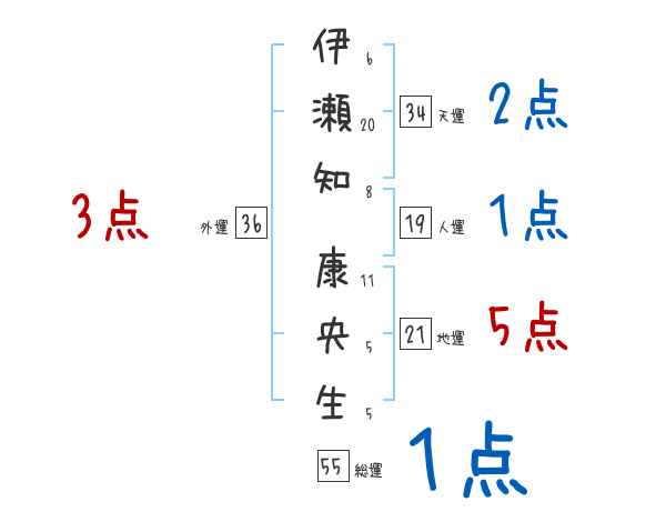 伊瀬知康央生さんの画数の鑑定結果