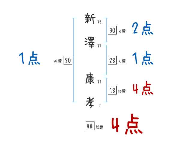 天運![]() | 新澤康孝さんの天運は30画の2つ星!浮き沈みの激しさに注意しましょう。 家系が持つ宿命的な運勢を表します。祖先から受け継いだ苗字ですので自分の力が及びません。家柄を象徴します。 |