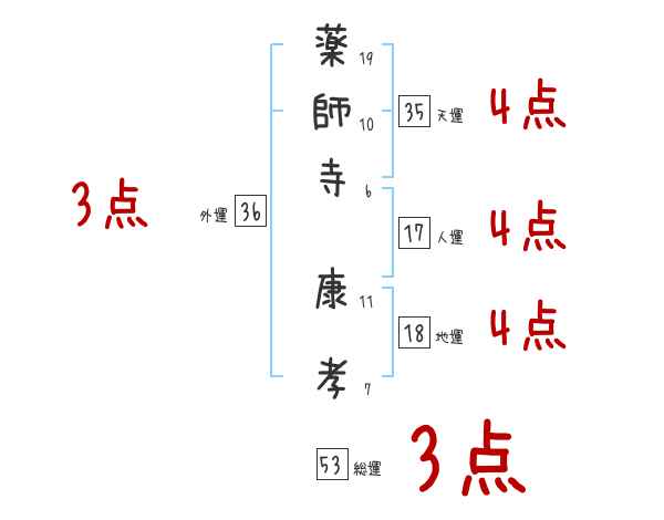 外運![]() | 薬師寺康孝さんの外運は36画の3つ星!先見性が豊かです。多少神経質で苦労することも。 生活面を象徴する運勢です。外部から受ける影響力を表し、結婚運、家庭運や職場、環境への順応性を表します。 |