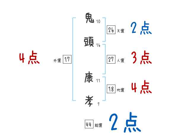 天運![]() | 鬼頭康孝さんの天運は26画の2つ星!波瀾万丈かも。信頼できる人を大事にしましょう。 家系が持つ宿命的な運勢を表します。祖先から受け継いだ苗字ですので自分の力が及びません。家柄を象徴します。 |