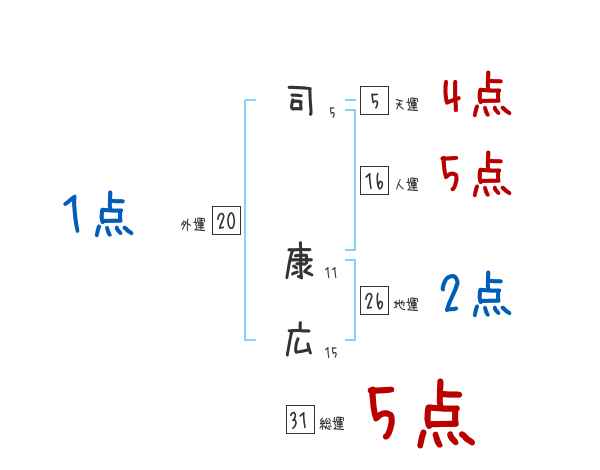 天運![]() | 司康広さんの天運は5画の4つ星!健康で安泰。協調性に優れ、財産に恵まれる。 家系が持つ宿命的な運勢を表します。祖先から受け継いだ苗字ですので自分の力が及びません。家柄を象徴します。 |