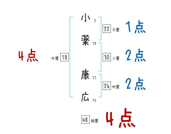 天運![]() | 小薬康広さんの天運は22画の1つ星!努力することが苦手ないっぽう手先が器用。芸術性にも優れる。 家系が持つ宿命的な運勢を表します。祖先から受け継いだ苗字ですので自分の力が及びません。家柄を象徴します。 |