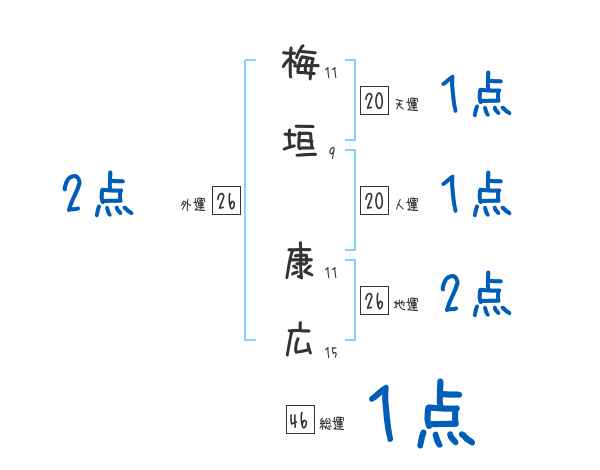 外運![]() | 梅垣康広さんの外運は26画の2つ星!波瀾万丈かも。信頼できる人を大事にしましょう。 生活面を象徴する運勢です。外部から受ける影響力を表し、結婚運、家庭運や職場、環境への順応性を表します。 |