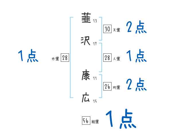 外運![]() | 韮沢康広さんの外運は28画の1つ星!家庭環境に注意。スポーツで活躍できる能力があるかも。 生活面を象徴する運勢です。外部から受ける影響力を表し、結婚運、家庭運や職場、環境への順応性を表します。 |