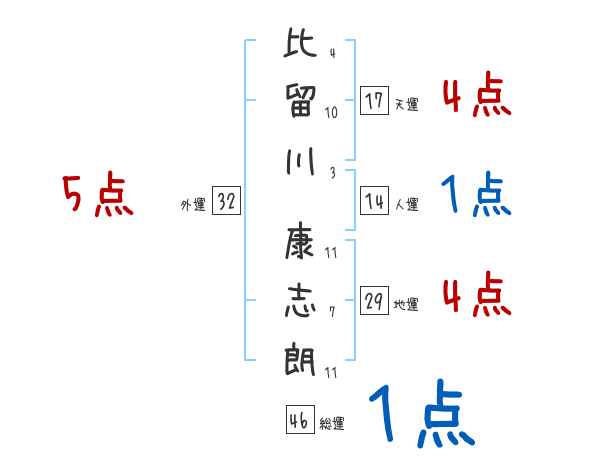 外運![]() | 比留川康志朗さんの外運は32画の5つ星!柔軟性があり成功する。チャンスが多く金運が良い。 生活面を象徴する運勢です。外部から受ける影響力を表し、結婚運、家庭運や職場、環境への順応性を表します。 |