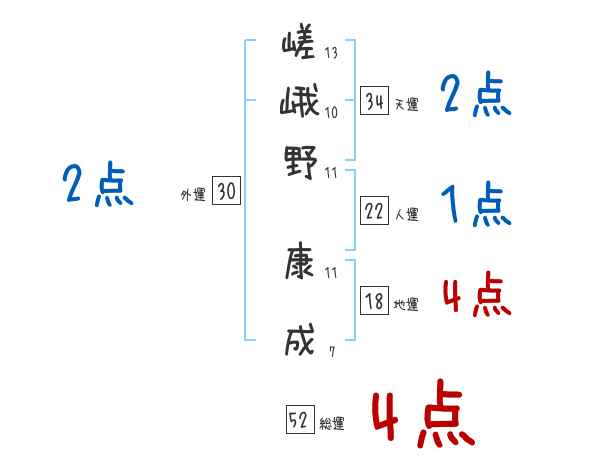 人運![]() | 嵯峨野康成さんの人運は22画の1つ星!努力することが苦手ないっぽう手先が器用。芸術性にも優れる。 性格や才能などを表す2番目に重要な運勢です。人間関係や協調性、社会的な成功に影響します。主に20歳から50歳ぐらいまでの中年期の運勢を表します。 |