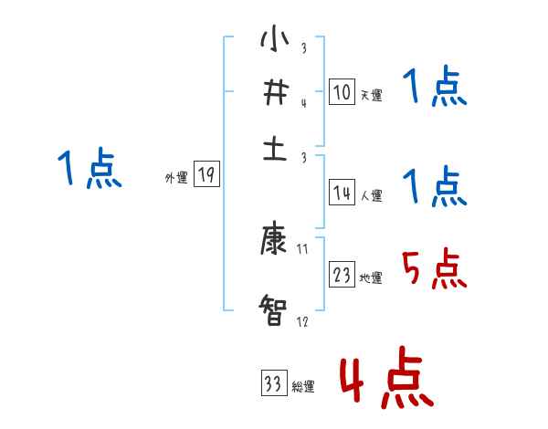 外運![]() | 小井土康智さんの外運は19画の1つ星!優れた才能を持ちますが、協調性が足りないことも。周りの人と協力する事を意識しましょう。 生活面を象徴する運勢です。外部から受ける影響力を表し、結婚運、家庭運や職場、環境への順応性を表します。 |