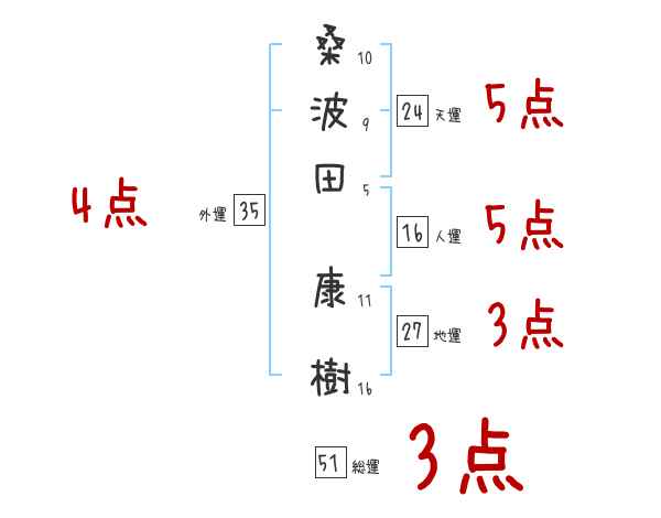 外運![]() | 桑波田康樹さんの外運は35画の4つ星!温厚な性格で感受性が高い。穏和な性格で人望が厚い。 生活面を象徴する運勢です。外部から受ける影響力を表し、結婚運、家庭運や職場、環境への順応性を表します。 |