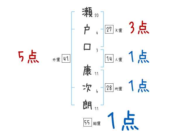 総運![]() | 瀬戸口康次朗さんの総運は55画の1つ星!欲張りな性格で軽率な行動に注意しましょう。病気に気をつけて。 あなたの人生を表す1番重要な運勢です。生涯を通じて影響する総合運となり、主に50歳以降の晩年期に影響を及ぼします。 |