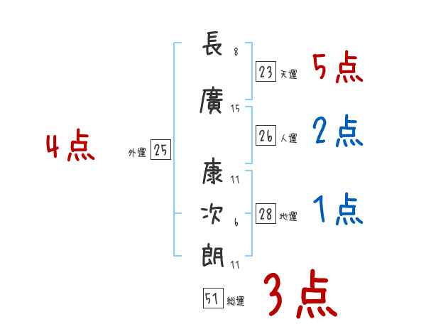天運![]() | 長廣康次朗さんの天運は23画の5つ星!想像力に優れ活力がある。一代で成功し名誉を手に入れる。 家系が持つ宿命的な運勢を表します。祖先から受け継いだ苗字ですので自分の力が及びません。家柄を象徴します。 |