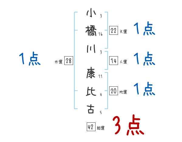 総運![]() | 小橋川康比古さんの総運は42画の3つ星!病気に注意。多芸であるが消極的でおとなしい。 あなたの人生を表す1番重要な運勢です。生涯を通じて影響する総合運となり、主に50歳以降の晩年期に影響を及ぼします。 |