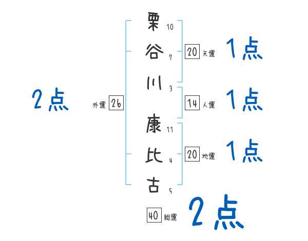 外運![]() | 栗谷川康比古さんの外運は26画の2つ星!波瀾万丈かも。信頼できる人を大事にしましょう。 生活面を象徴する運勢です。外部から受ける影響力を表し、結婚運、家庭運や職場、環境への順応性を表します。 |
