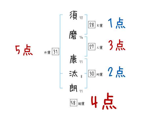 総運![]() | 須磨康汰朗さんの総運は58画の4つ星!安定した生活。大器晩成タイプ。 あなたの人生を表す1番重要な運勢です。生涯を通じて影響する総合運となり、主に50歳以降の晩年期に影響を及ぼします。 |