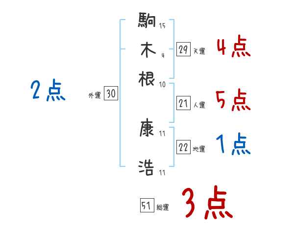 天運![]() | 駒木根康浩さんの天運は29画の4つ星!完全主義で才能がある。厳格な心の持ち主。 家系が持つ宿命的な運勢を表します。祖先から受け継いだ苗字ですので自分の力が及びません。家柄を象徴します。 |