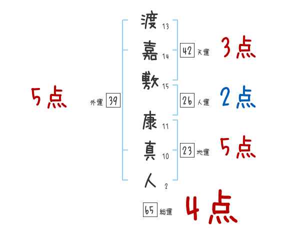 外運![]() | 渡嘉敷康真人さんの外運は39画の5つ星!社交性に優れ人望が厚い。人の上に立ち成功する。 生活面を象徴する運勢です。外部から受ける影響力を表し、結婚運、家庭運や職場、環境への順応性を表します。 |