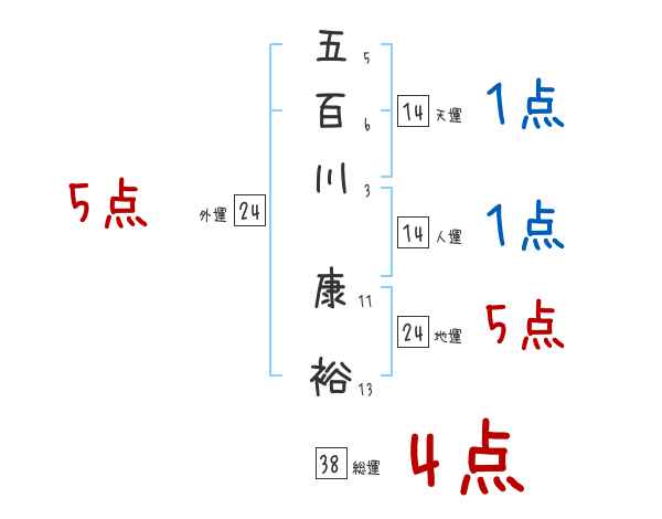 天運![]() | 五百川康裕さんの天運は14画の1つ星!人に対して優しいがストレスを溜め込みがち。人間関係のトラブルを避けるよう気をつけましょう。 家系が持つ宿命的な運勢を表します。祖先から受け継いだ苗字ですので自分の力が及びません。家柄を象徴します。 |
