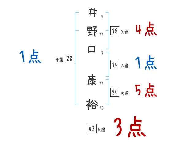 天運![]() | 井野口康裕さんの天運は18画の4つ星!情熱的で剛気。忍耐力があり信頼される。 家系が持つ宿命的な運勢を表します。祖先から受け継いだ苗字ですので自分の力が及びません。家柄を象徴します。 |