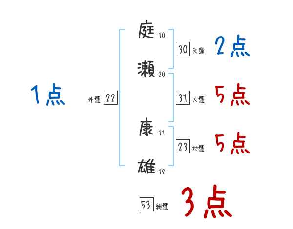総運![]() | 庭瀬康雄さんの総運は53画の3つ星!やや見栄っ張りで虚栄心がある。散財に注意。 あなたの人生を表す1番重要な運勢です。生涯を通じて影響する総合運となり、主に50歳以降の晩年期に影響を及ぼします。 |