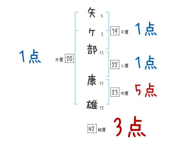 天運![]() | 矢ヶ部康雄さんの天運は19画の1つ星!優れた才能を持ちますが、協調性が足りないことも。周りの人と協力する事を意識しましょう。 家系が持つ宿命的な運勢を表します。祖先から受け継いだ苗字ですので自分の力が及びません。家柄を象徴します。 |
