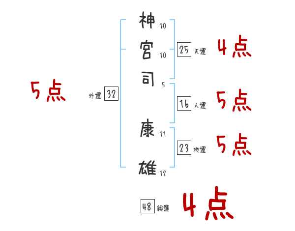 天運![]() | 神宮司康雄さんの天運は25画の4つ星!個性があり才能があふれる。強運の持ち主で発展する。 家系が持つ宿命的な運勢を表します。祖先から受け継いだ苗字ですので自分の力が及びません。家柄を象徴します。 |