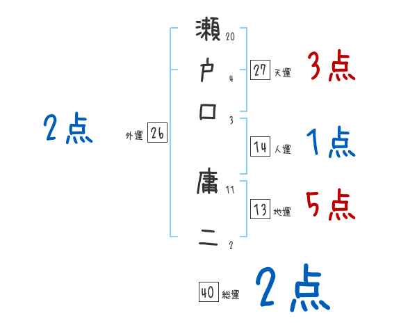 外運![]() | 瀬戸口庸二さんの外運は26画の2つ星!波瀾万丈かも。信頼できる人を大事にしましょう。 生活面を象徴する運勢です。外部から受ける影響力を表し、結婚運、家庭運や職場、環境への順応性を表します。 |