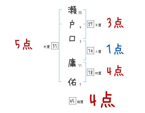 総運![]() | 瀬戸口庸佑さんの総運は45画の4つ星!もくもくと物事を進め達成する。地味な努力家。 あなたの人生を表す1番重要な運勢です。生涯を通じて影響する総合運となり、主に50歳以降の晩年期に影響を及ぼします。 |