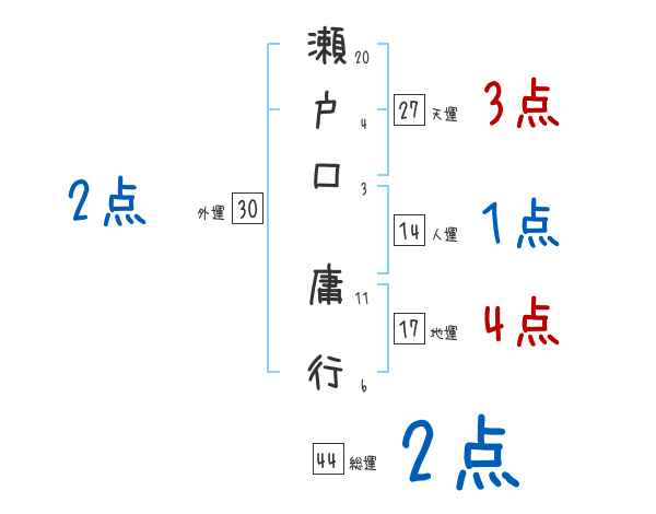 外運![]() | 瀬戸口庸行さんの外運は30画の2つ星!浮き沈みの激しさに注意しましょう。 生活面を象徴する運勢です。外部から受ける影響力を表し、結婚運、家庭運や職場、環境への順応性を表します。 |