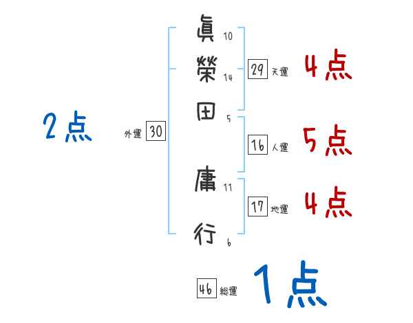 天運![]() | 眞榮田庸行さんの天運は29画の4つ星!完全主義で才能がある。厳格な心の持ち主。 家系が持つ宿命的な運勢を表します。祖先から受け継いだ苗字ですので自分の力が及びません。家柄を象徴します。 |