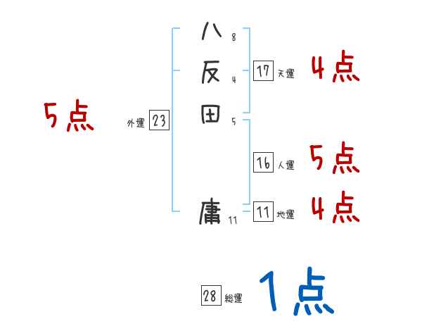 人運![]() | 八反田庸さんの人運は16画の5つ星!人望が厚く大きく発展する。逆転成功が見える。 性格や才能などを表す2番目に重要な運勢です。人間関係や協調性、社会的な成功に影響します。主に20歳から50歳ぐらいまでの中年期の運勢を表します。 |
