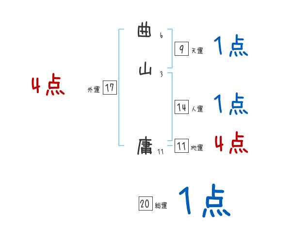 天運![]() | 曲山庸さんの天運は9画の1つ星!消極的で才能を発揮することが苦手なことも。周りの意見に耳を傾けましょう。 家系が持つ宿命的な運勢を表します。祖先から受け継いだ苗字ですので自分の力が及びません。家柄を象徴します。 |