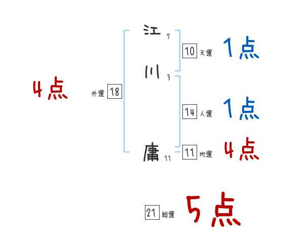 外運![]() | 江川庸さんの外運は18画の4つ星!情熱的で剛気。忍耐力があり信頼される。 生活面を象徴する運勢です。外部から受ける影響力を表し、結婚運、家庭運や職場、環境への順応性を表します。 |
