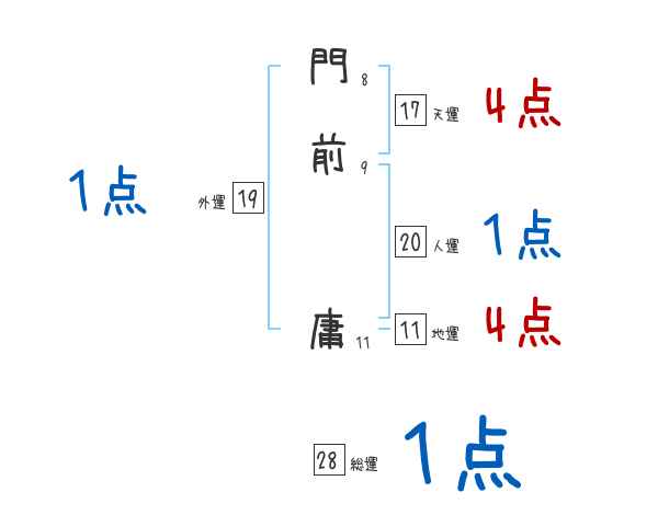 総運![]() | 門前庸さんの総運は28画の1つ星!家庭環境に注意。スポーツで活躍できる能力があるかも。 あなたの人生を表す1番重要な運勢です。生涯を通じて影響する総合運となり、主に50歳以降の晩年期に影響を及ぼします。 |