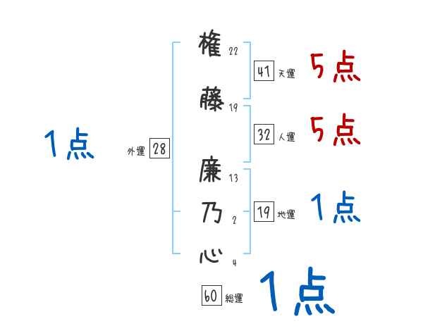 | 総運  | 権藤廉乃心さんの総運は60画の1つ星!悲観的で迷いやすい。波乱が多く損をしないように。あなたの人生を表す1番重要な運勢です。生涯を通じて影響する総合運となり、主に50歳以降の晩年期に影響を及ぼします。 |