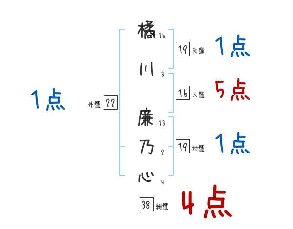 | 天運  | 橘川廉乃心さんの天運は19画の1つ星!優れた才能を持ちますが、協調性が足りないことも。周りの人と協力する事を意識しましょう。家系が持つ宿命的な運勢を表します。祖先から受け継いだ苗字ですので自分の力が及びません。家柄を象徴します。 |