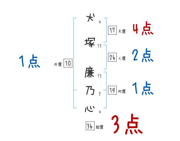 | 総運  | 犬塚廉乃心さんの総運は36画の3つ星!先見性が豊かです。多少神経質で苦労することも。あなたの人生を表す1番重要な運勢です。生涯を通じて影響する総合運となり、主に50歳以降の晩年期に影響を及ぼします。 |