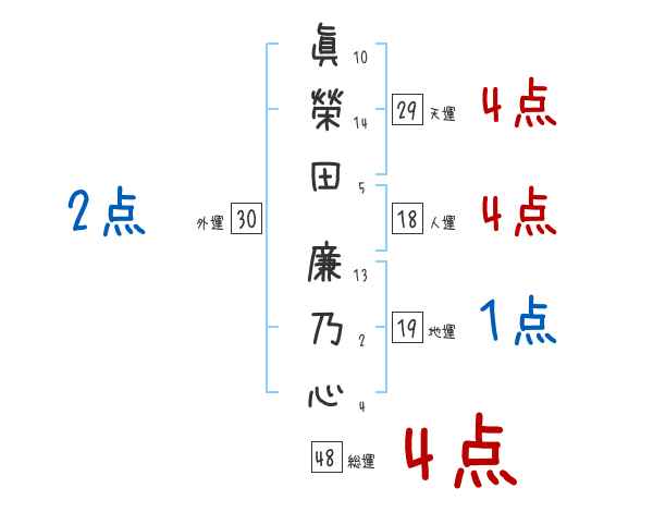 天運![]() | 眞榮田廉乃心さんの天運は29画の4つ星!完全主義で才能がある。厳格な心の持ち主。 家系が持つ宿命的な運勢を表します。祖先から受け継いだ苗字ですので自分の力が及びません。家柄を象徴します。 |