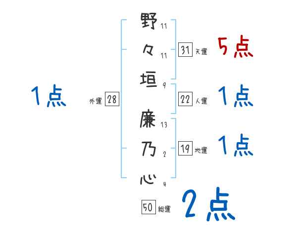 人運![]() | 野々垣廉乃心さんの人運は22画の1つ星!努力することが苦手ないっぽう手先が器用。芸術性にも優れる。 性格や才能などを表す2番目に重要な運勢です。人間関係や協調性、社会的な成功に影響します。主に20歳から50歳ぐらいまでの中年期の運勢を表します。 |