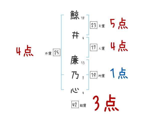 天運![]() | 鯨井廉乃心さんの天運は23画の5つ星!想像力に優れ活力がある。一代で成功し名誉を手に入れる。 家系が持つ宿命的な運勢を表します。祖先から受け継いだ苗字ですので自分の力が及びません。家柄を象徴します。 |
