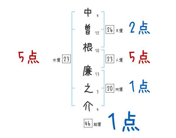 外運![]() | 中曽根廉之介さんの外運は23画の5つ星!想像力に優れ活力がある。一代で成功し名誉を手に入れる。 生活面を象徴する運勢です。外部から受ける影響力を表し、結婚運、家庭運や職場、環境への順応性を表します。 |