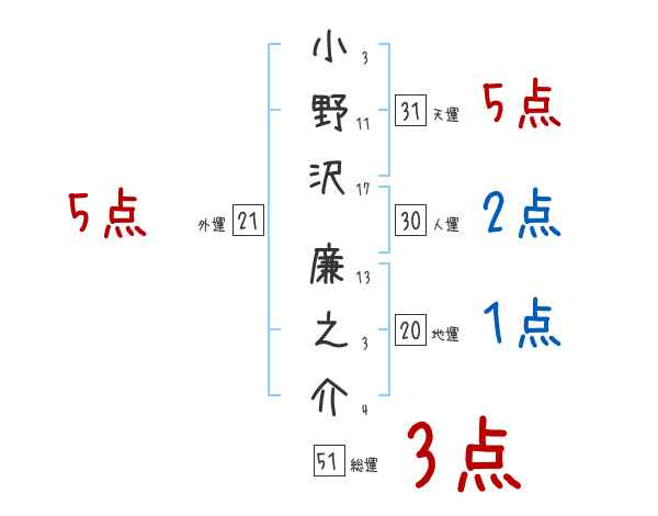外運![]() | 小野沢廉之介さんの外運は21画の5つ星!統率力がある。独立し成功する。名誉を手に入れる。 生活面を象徴する運勢です。外部から受ける影響力を表し、結婚運、家庭運や職場、環境への順応性を表します。 |
