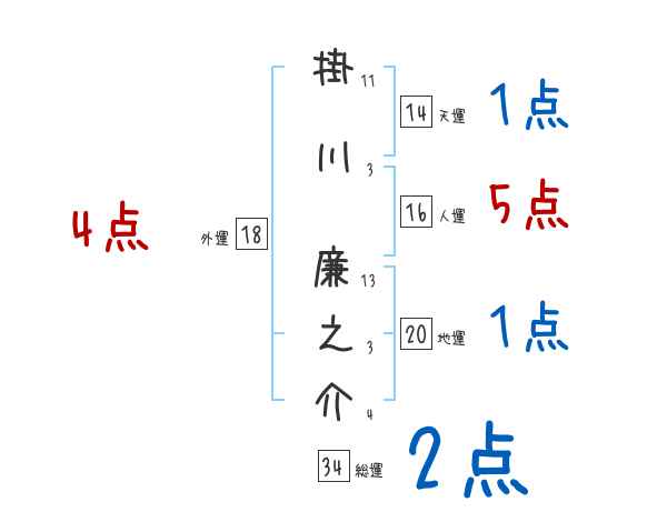外運![]() | 掛川廉之介さんの外運は18画の4つ星!情熱的で剛気。忍耐力があり信頼される。 生活面を象徴する運勢です。外部から受ける影響力を表し、結婚運、家庭運や職場、環境への順応性を表します。 |