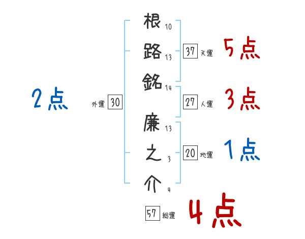 総運![]() | 根路銘廉之介さんの総運は57画の4つ星!向上心があり人望がある。地位を得る。 あなたの人生を表す1番重要な運勢です。生涯を通じて影響する総合運となり、主に50歳以降の晩年期に影響を及ぼします。 |