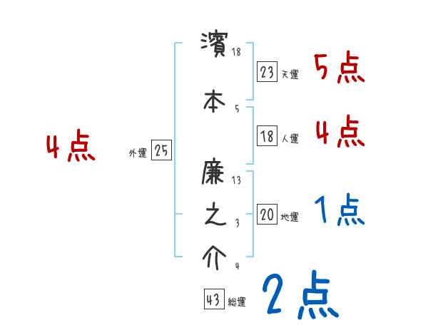 | 外運  | 濱本廉之介さんの外運は25画の4つ星!個性があり才能があふれる。強運の持ち主で発展する。生活面を象徴する運勢です。外部から受ける影響力を表し、結婚運、家庭運や職場、環境への順応性を表します。 |