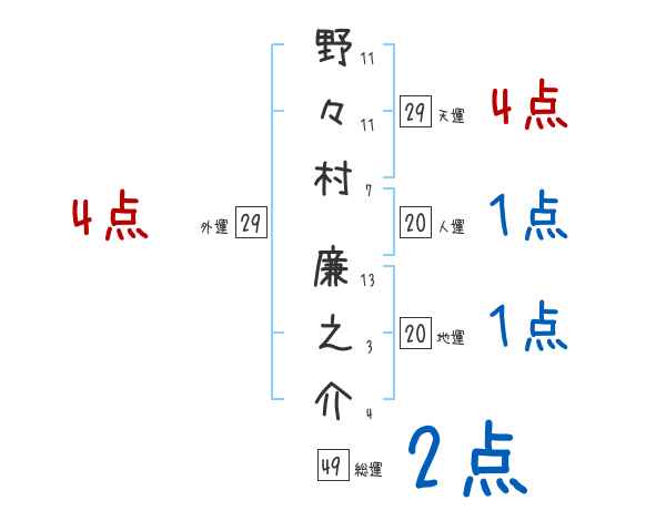 | 天運  | 野々村廉之介さんの天運は29画の4つ星!完全主義で才能がある。厳格な心の持ち主。家系が持つ宿命的な運勢を表します。祖先から受け継いだ苗字ですので自分の力が及びません。家柄を象徴します。 |
