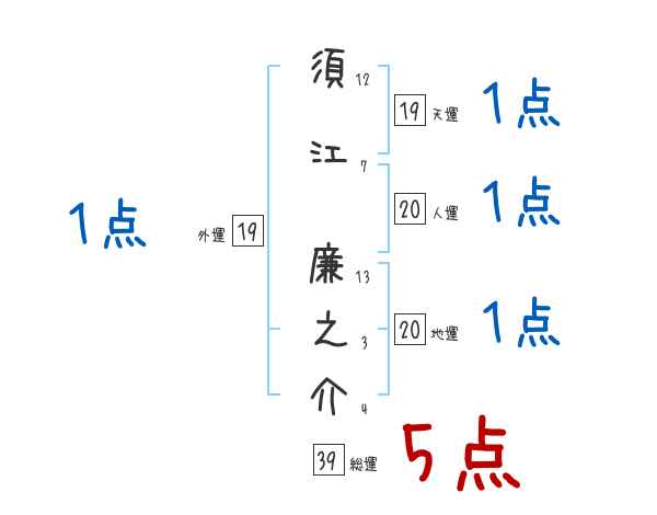 総運![]() | 須江廉之介さんの総運は39画の5つ星!社交性に優れ人望が厚い。人の上に立ち成功する。 あなたの人生を表す1番重要な運勢です。生涯を通じて影響する総合運となり、主に50歳以降の晩年期に影響を及ぼします。 |